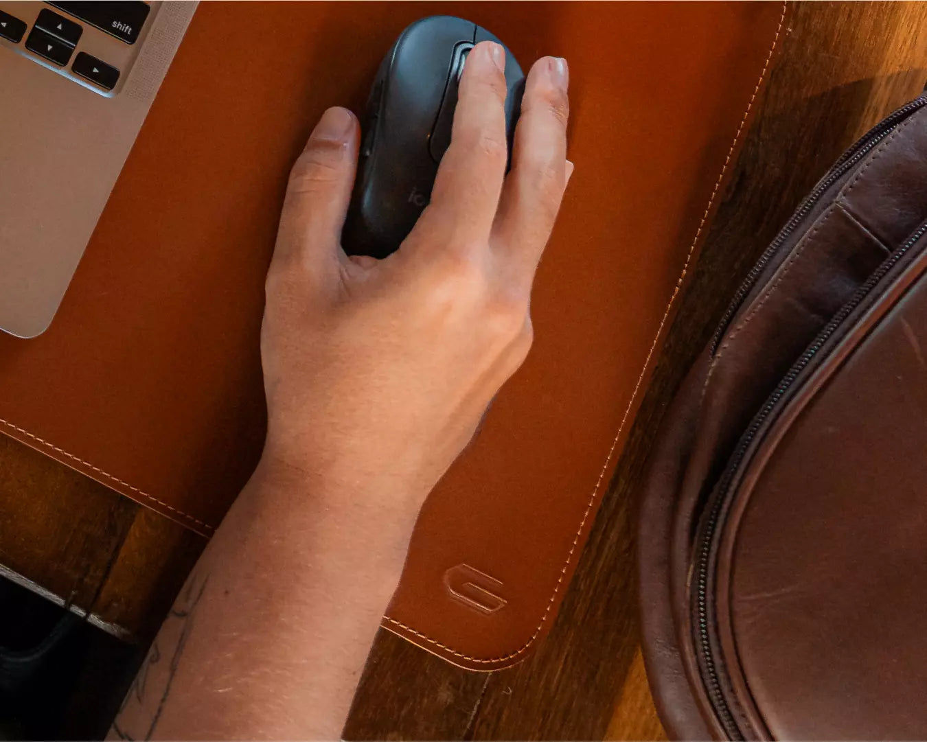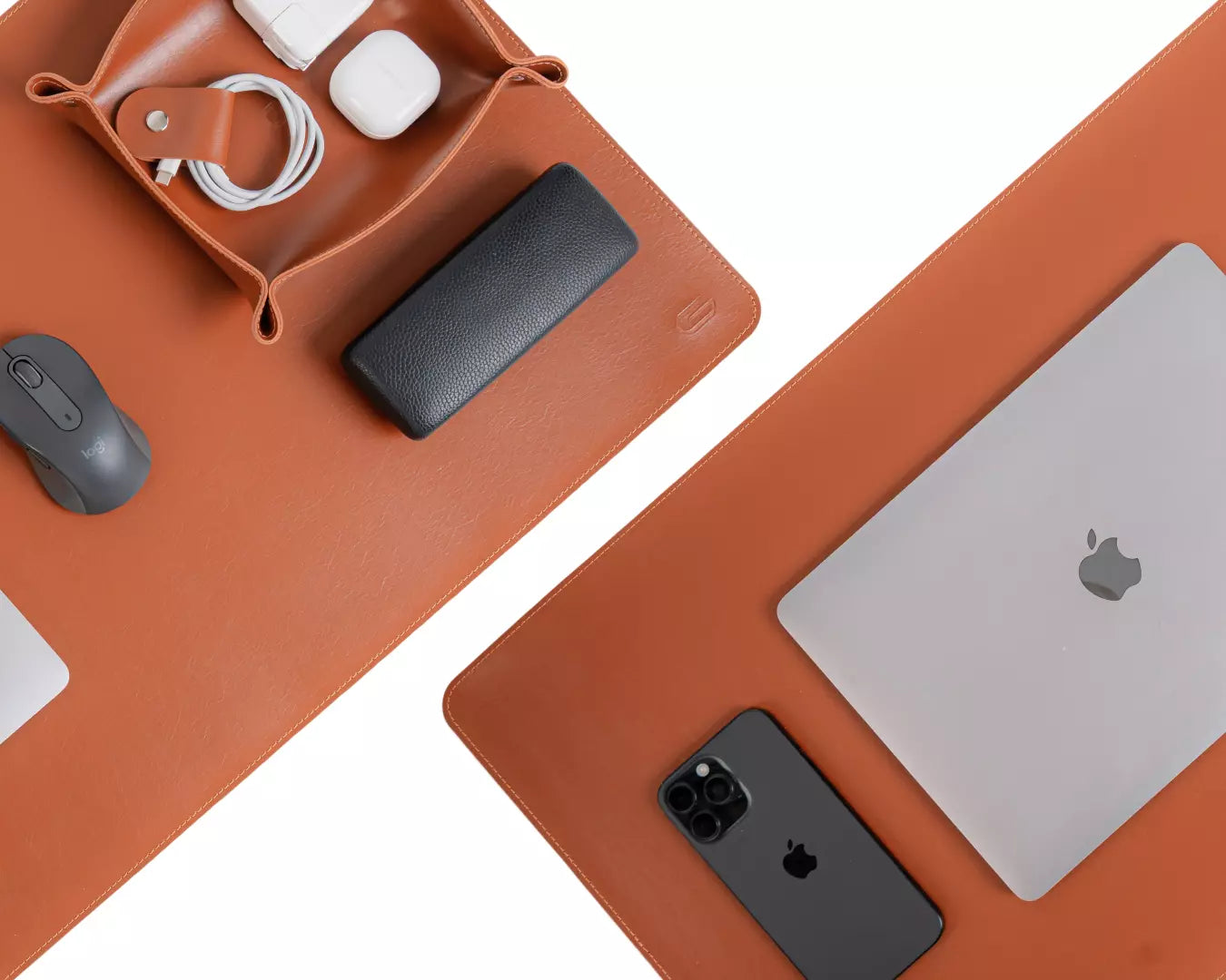 Deskpad 90cm x 40cm Cavaliere confeccionado artesanalmente em Montana™, com verso em camurça e costura contrastante em todo o contorno.