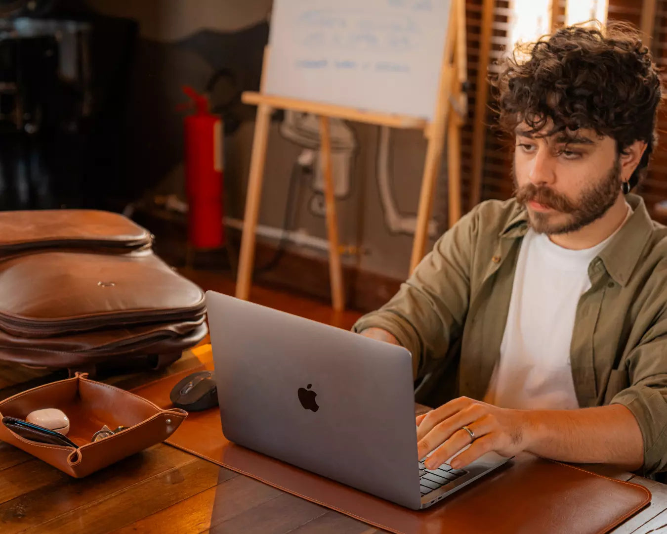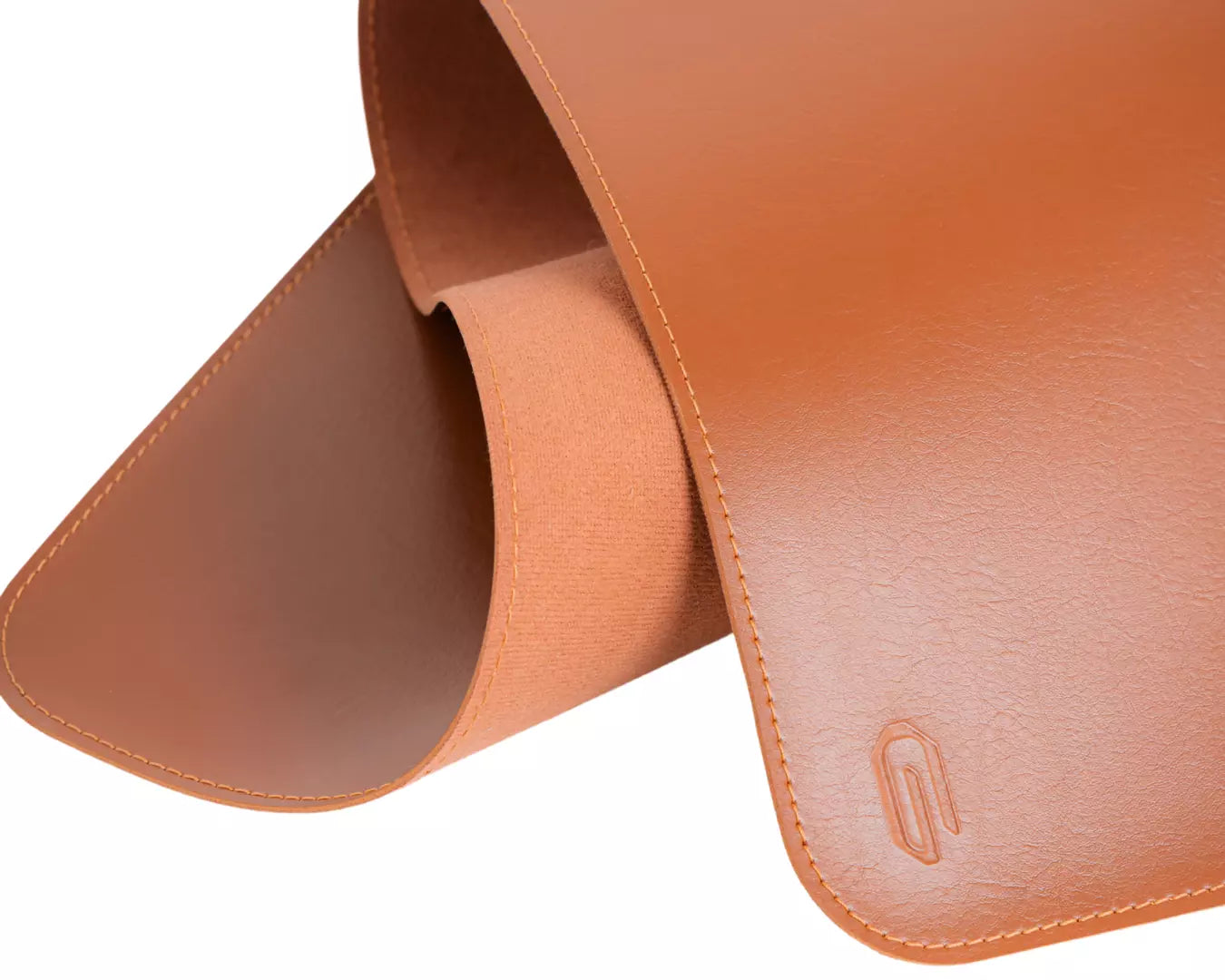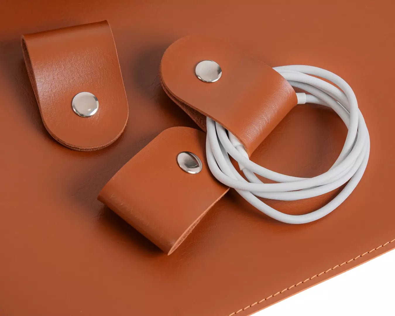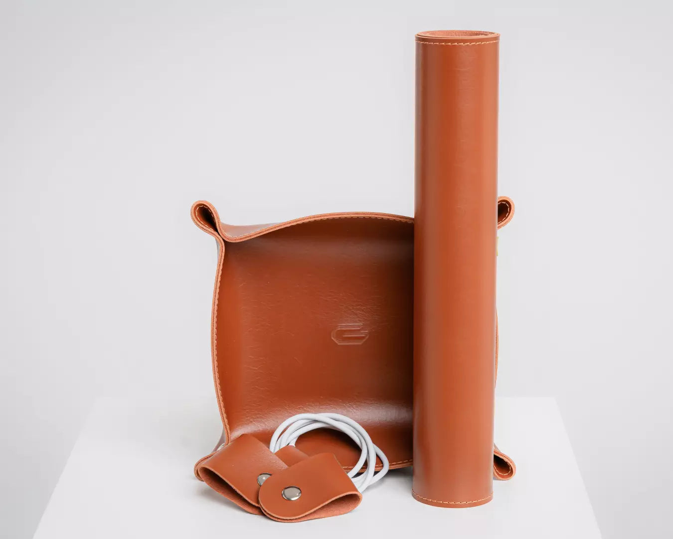Pack com 1x Deskpad Cavaliere, 1x Porta-objetos Magnus e 3x organizador de cabos Ares. Peças feitas à mão em Montana™ com interior em camurça.