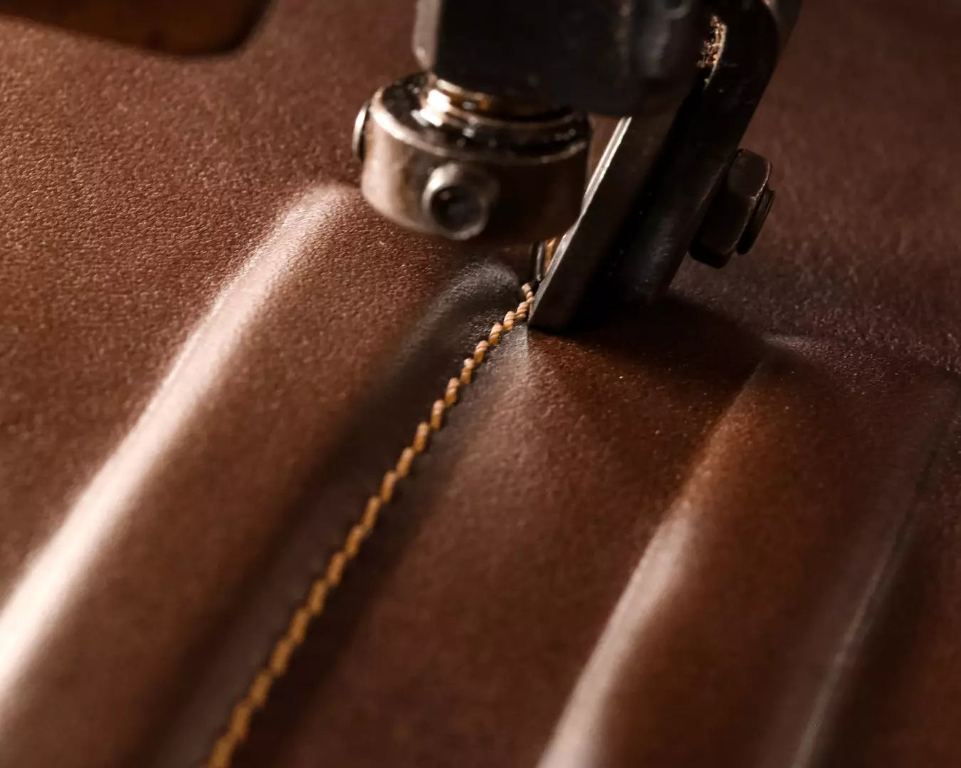 Couro bovino de grão integral, curtido artesanalmente com taninos naturais extraídos de fontes orgânicas.